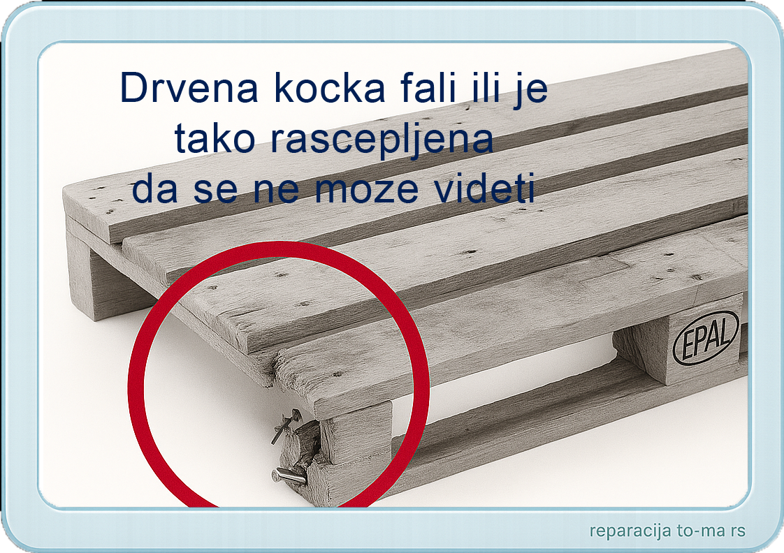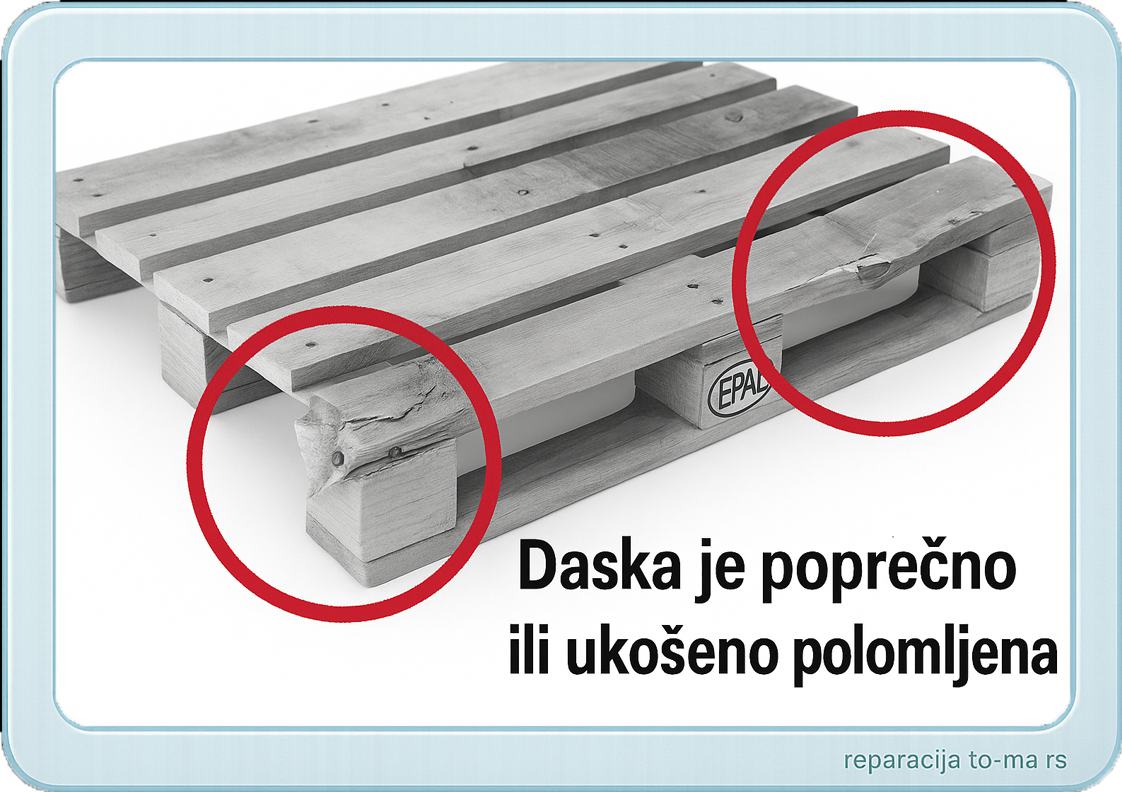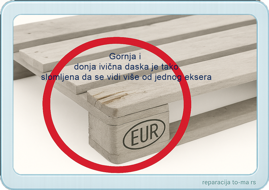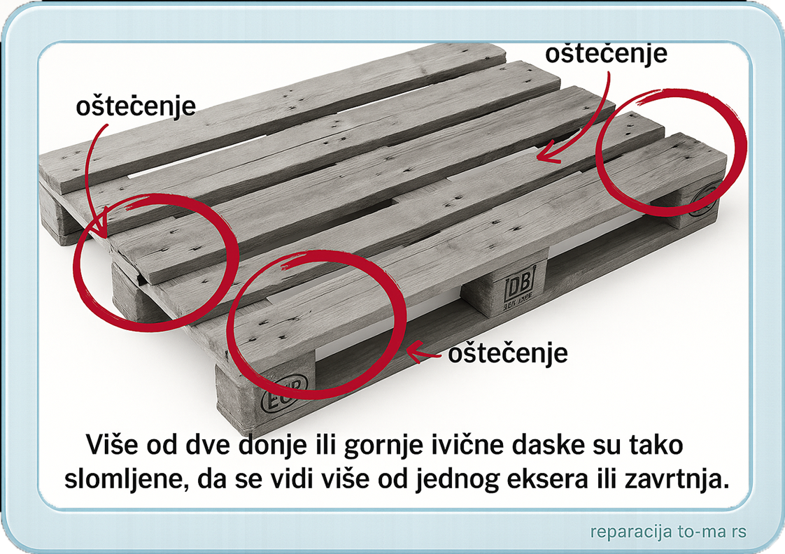 Ukoliko EURO-palete imaju jedno ili više od prikazanih oštećenja, onda se ne mogu zameniti i moraju biti popravljene prema odredbama instrukcijskog lista UIC, broj 435-4.
