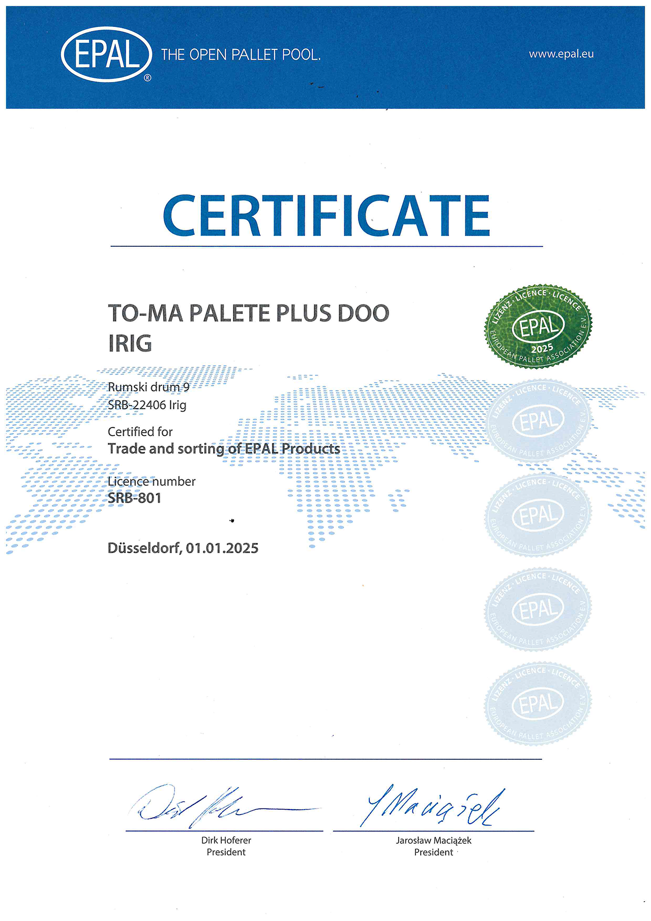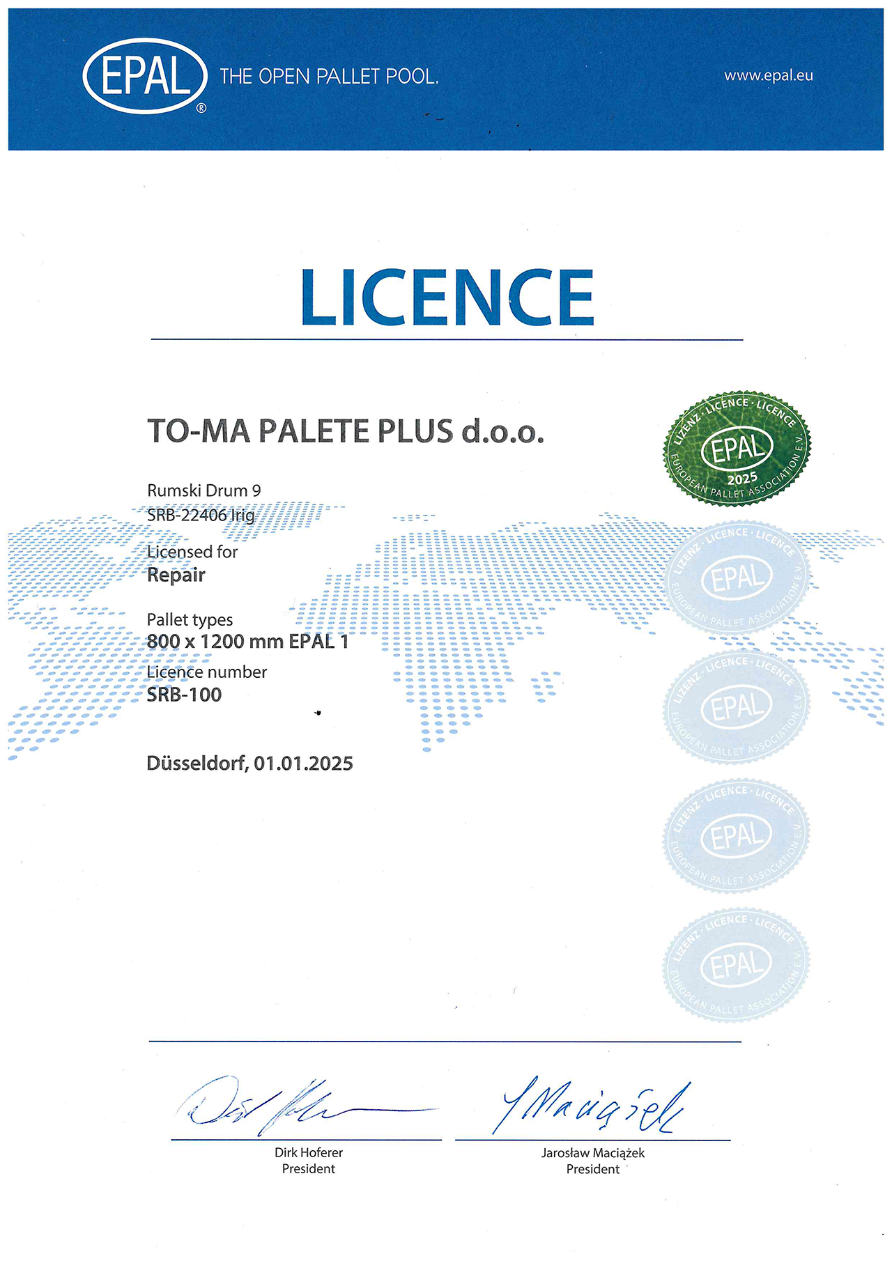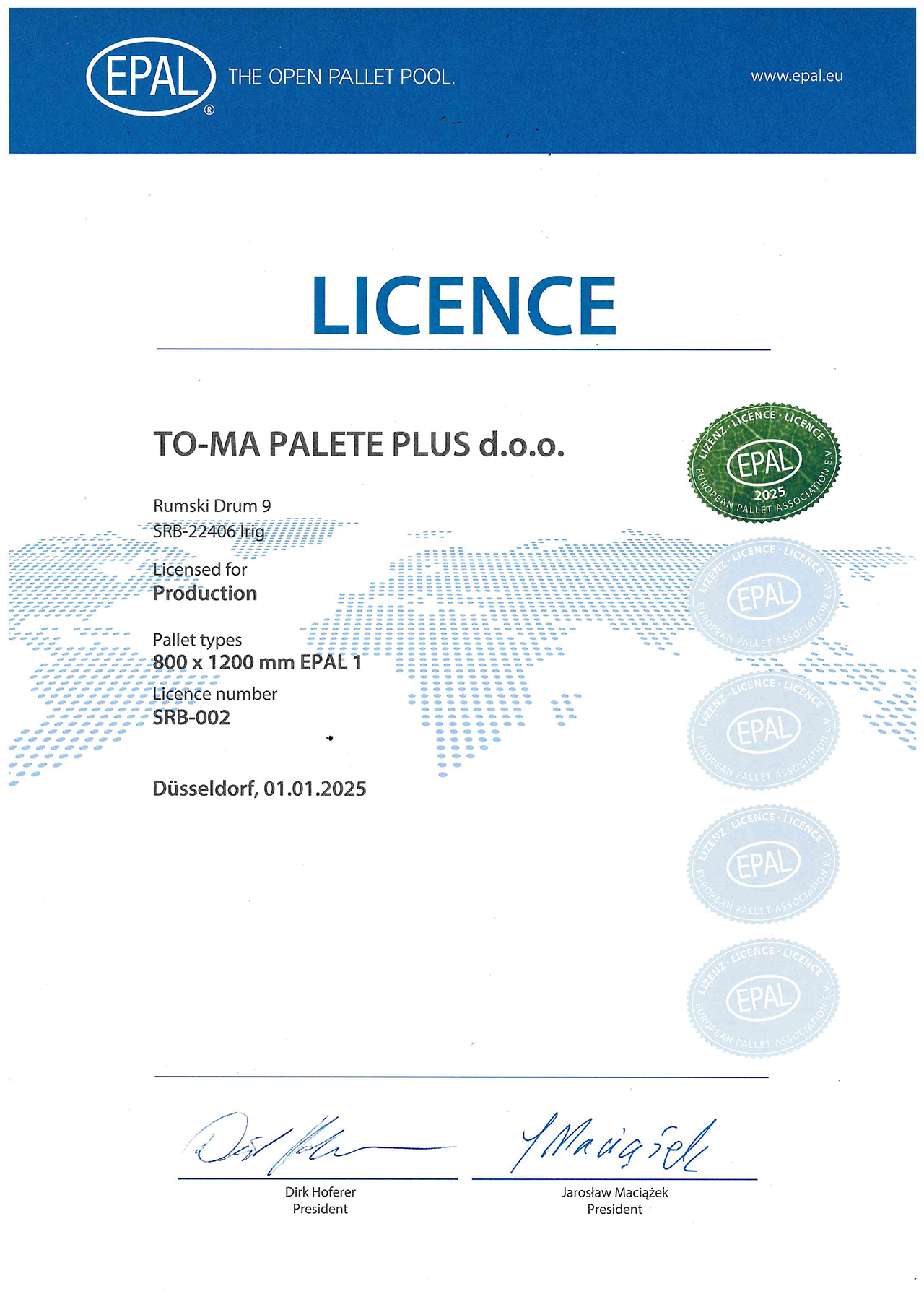 Nosioci smo licence EPAL za proizvodnju i reparaciju paleta.Nosioci smo dozvole za obavljanje poslova toplotnog tretiranja paleta i drugog drvenog materijala za pakovanje.